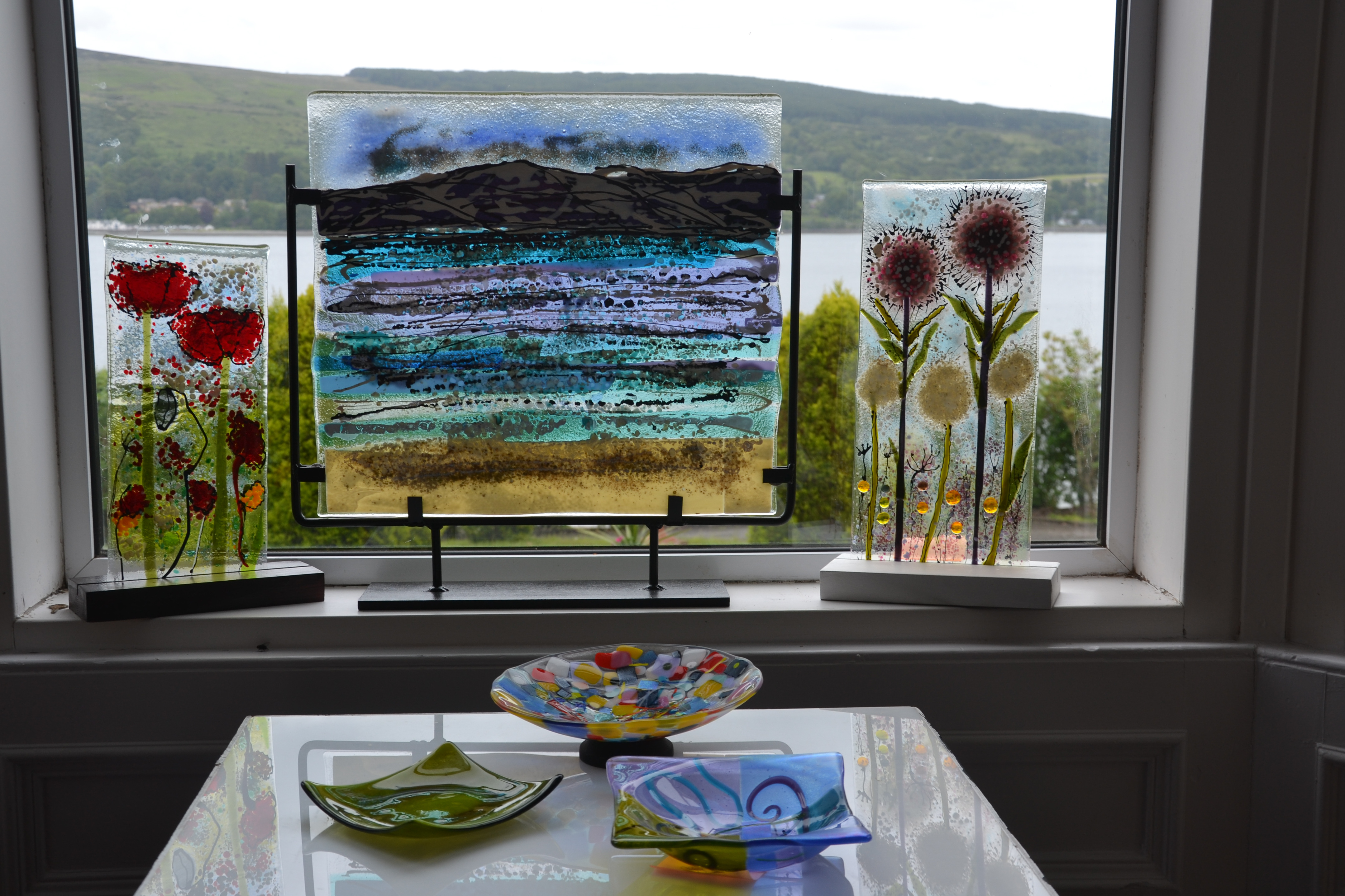 Cass Peters, the glass artist, whose work was showcased in the exhibition, has her studio in Alexandria. In her studio Cass teaches fused and leaded glass techniques as well as repairing stained glass or creating cummissioned new pieces. Cass Peters Glass Art website The 4 six foot tall glass sculptures she created for Dundee Botanic Gardens are now on display. The gardens are well worth a visit if you are in Dundee (Dundee University Botanic Gardens website)
